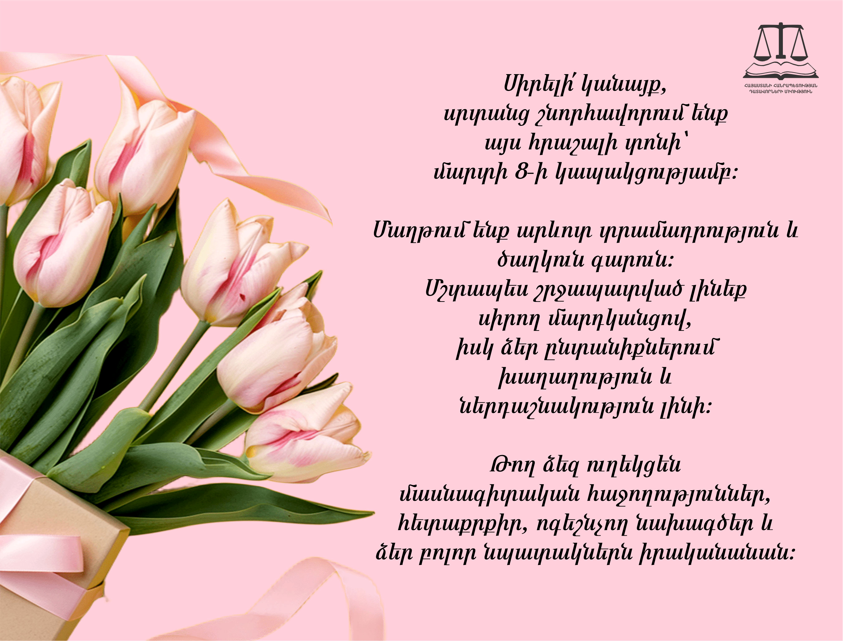 Սիրելի՛ կանայք, սրտանց շնորհավորում ենք այս հրաշալի տոնի՝ մարտի 8-ի կապակցությամբ։