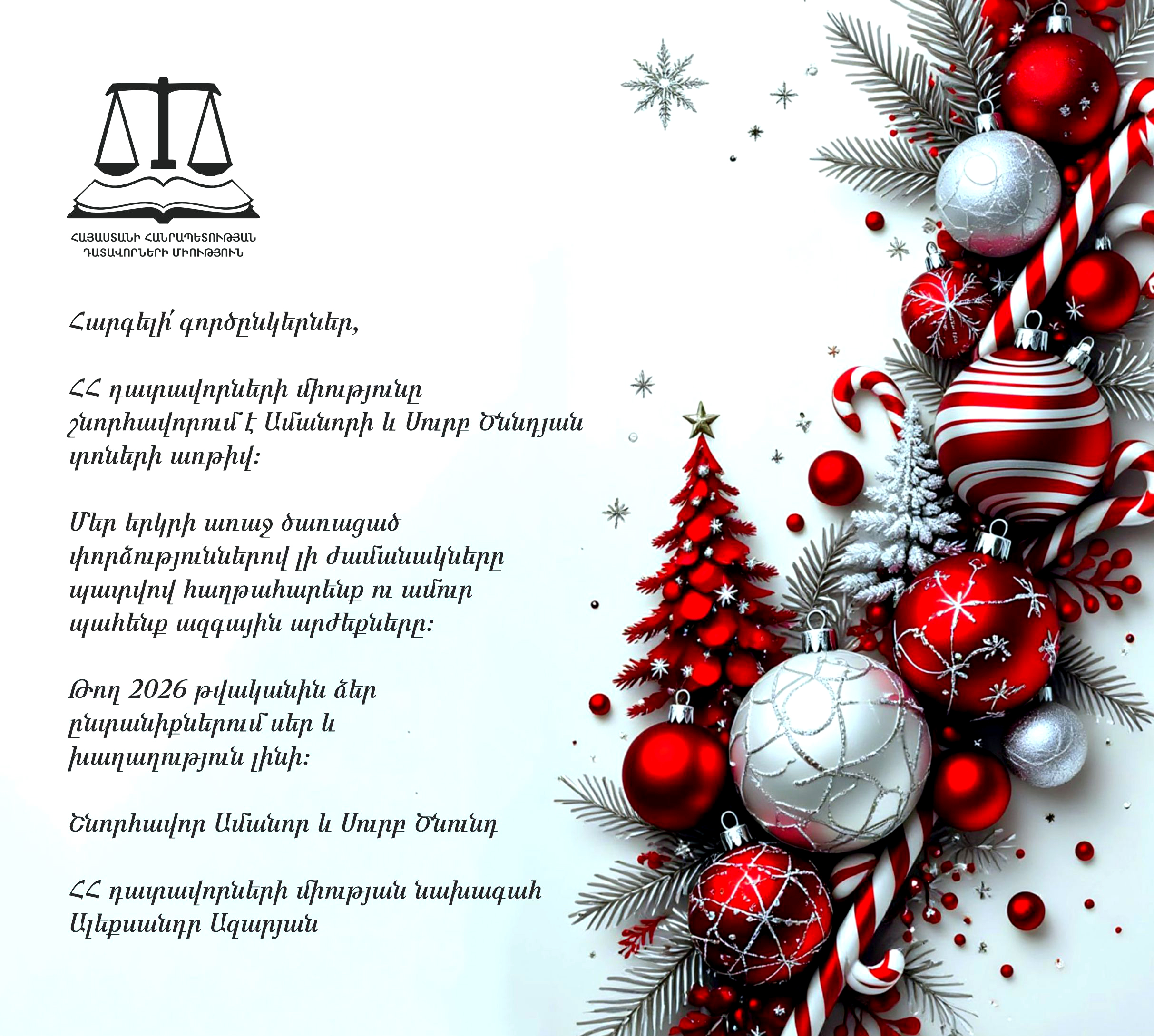 ՀՀ դատավորների միությունը շնորհավորում է Ամանորի և Սուրբ Ծննդյան տոների առթիվ: Մեր երկրի առաջ ծառացած փորձություններով լի ժամանակները պատվով հաղթահարենք ու ամուր պահենք ազգային արժեքները: